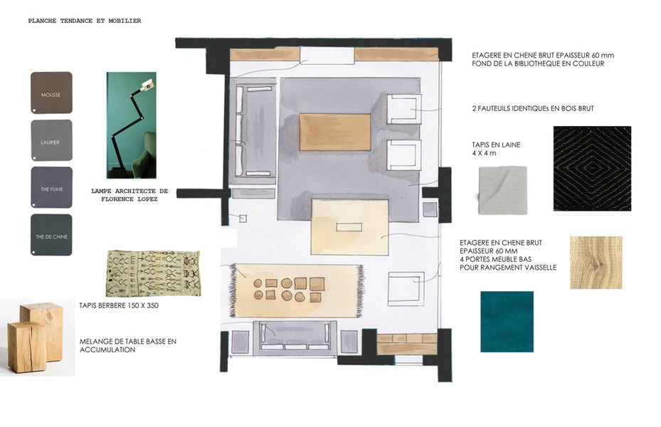 Elle sélectionne également matériaux, peintures, papiers peints, tissus, mobilier, luminaires.